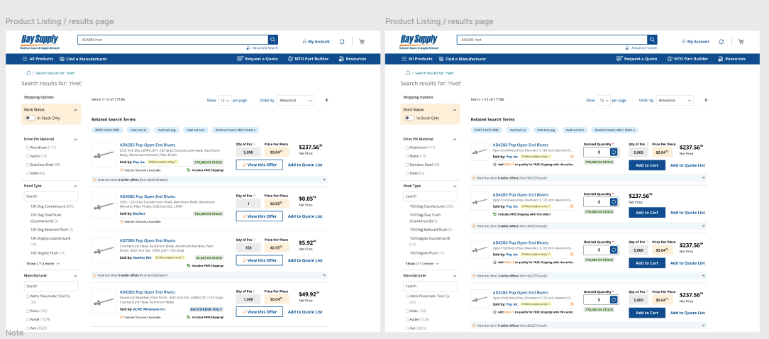 Optimization: Removed the quantity field and 'Add to Cart' buttons from the PLP. Instead, introduced a primary 'View Seller Offer(s)' CTA button to direct users to the PDP for comprehensive offer comparisons. Additionally, added a secondary 'Add to Quote List' button to facilitate quick quoting.